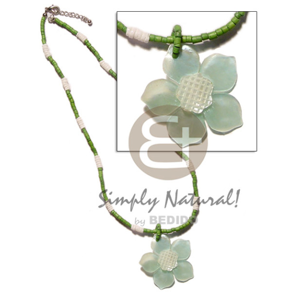 40mm dyed hammershell flower 2-3mm coco heishe green and white clam alt...