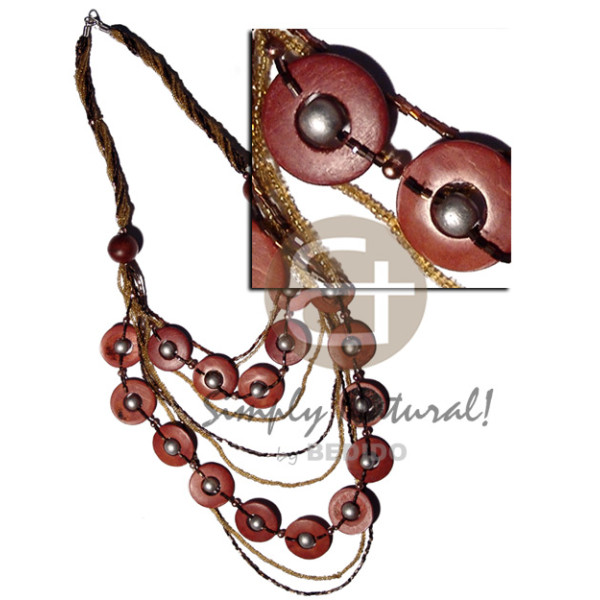 round woods beads brown kukui nuts, buri tiger seed, two 35mm palmwood circles and dangling gradua..
